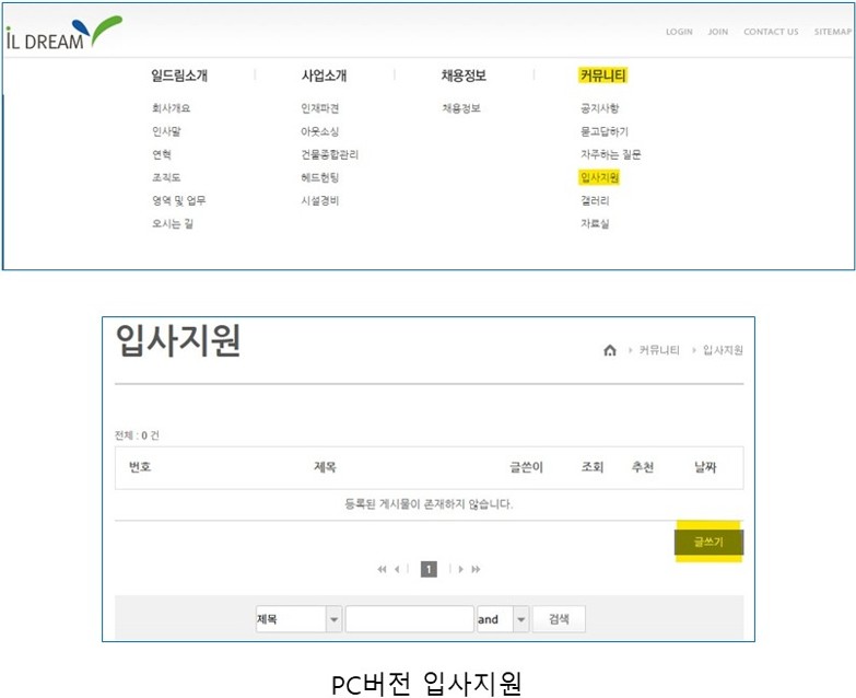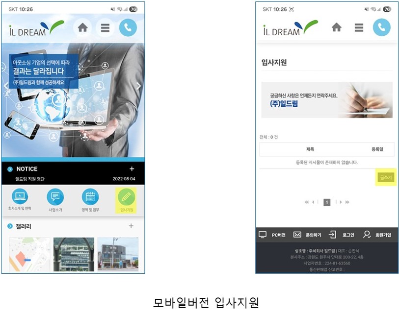 1. 입사지원 아이콘을 터치 합니다. 2. 화면의 오른쪽 아래에 있는 글쓰기를 터치합니다. 3. 이름을 시작으로 하나하나 꼼꼼히 작성한 뒤 저장을 터치합니다. 1. 커뮤니티 탭 아래에서 세번째에 있는 입사지원을 클릭합니다. 2. 화면의 오른쪽 아래에 있는 글쓰기를 클릭합니다. 3. 이름을 시작으로 하나하나 꼼꼼히 작성한 뒤 저장합니다.