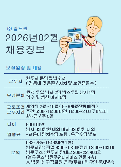 일드림 카카오톡 오픈채팅방 운영중입니다, 들어오셔서 다양한 채용정보 소식 받아가세요! https://open.kakao.com/o/gtM00rDh