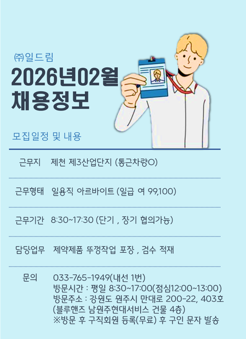 일드림 카카오톡 오픈채팅방 운영중입니다, 들어오셔서 다양한 채용정보 소식 받아가세요!