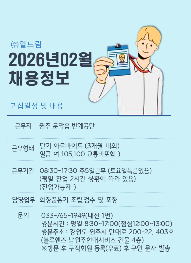 일드림 카카오톡 오픈채팅방 운영중입니다, 들어오셔서 다양한 채용정보 소식 받아가세요!